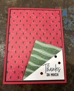 Lay the Watermelon print paper over the Basic White card front. Fold up the lower right corner of the Watermelon paper until you can see the stamped sentiment. Attach the Watermelon paper over the stamped white card front so the folded up corner shows the stamped image. Use a Stampin’ Dimensional behind the folded up corner to keep the folded up corner in place.