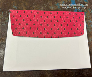 Envelope Flap: Cut Watermelon print paper 2 ¼ X 6. Glue the print paper to the envelope flap and trim using the flap as a guide.