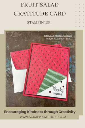 Card Front: Cut Basic White 3 ⅞ X 5 ⅛. Cut Watermelon print paper from Fruit Salad paper pack 3 ⅞ X 5 ⅛. Stamp sentiment from Memorable Blooms with Basic Black ink in the lower right corner of the Basic White card front.