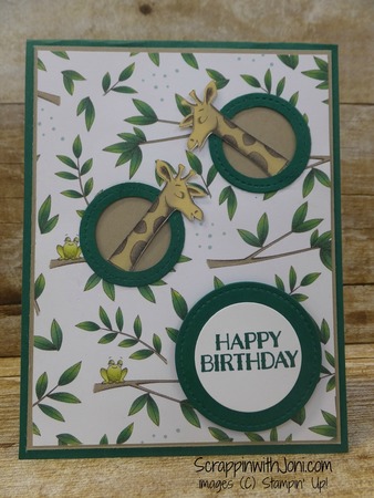 Use the 1" circle from the layering circles and cut two circles on card front where you want giraffes to peek through. (see picture).