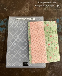 Attach the Flirty Flamingo strip to the green floral print card front ¼ from the left side. Emboss these papers with the Beautiful Pattern embossing folder.