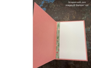 Card Insert: For the inside of your card, cut a piece of Basic White 4 X 5 ¼. Cut a piece of print paper used on the front of your card ½ X 4 (5 ¼). Attach to the side of the card insert. Stamp a sentiment or write a note before attaching this piece inside your card.