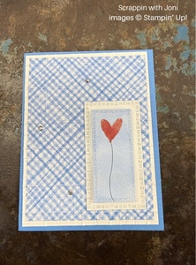 Use the rectangle die from the Texture Notes die set that measures 1 ¼ X 2 ¾ to cut the heart balloon from paper in the Love Notes Designer Series. Use the next size larger die from the Texture Notes die set to cut a rectangle from Basic White. Use Stampin Dimensionals to attach the balloon die cut piece to the Basic White rectangle. Attach both rectangles to the lower right corner of the card front. Add 3 silver embellishments from Adhesive-Backed Metallic Gems to the card front.
