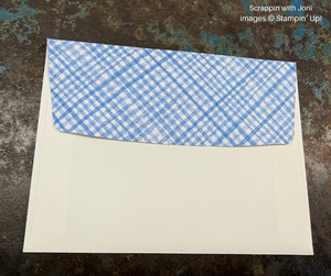 Envelope Flap: After cutting paper for your card front you will have a piece of blue plaid paper 2 ¼ X 6. Glue the print paper to the envelope flap and trim using the flap as a guide.