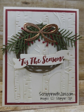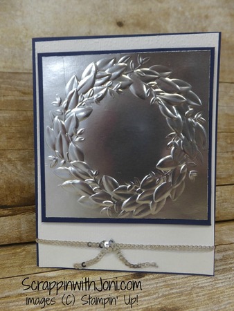 I am loving the new embossing folders in the new annual catalog. I used 2 of them on this card. Look close and you can see the subtle texture on the white card front. The beautiful seasonal wreath has more impact, especially when you emboss on silver foil.