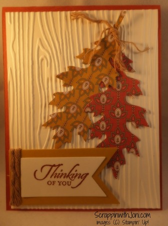 20 Sep 16 Thinking of You Fall Leaves Fall leaves make for a great masculine get well card. view products and instructions-> Cajun Craze 8-1/2" X 11" Cardstock 119684 Delightful Dijon 8-1/2" X 11" Cardstock 138338 Very Vanilla 8-1/2" X 11" Cardstock 101650 Petals & Paisleys Specialty Designer Series Paper 142017 Cajun Craze Classic Stampin' Pad 126965 Leaflets Framelits Dies 138283 Kraft Rope Trim 141996 Woodgrain Textured Impressions Embossing Folder 127821 Banners Framelits Die 132173 Stampin' Dimensionals 104430 Comment Print