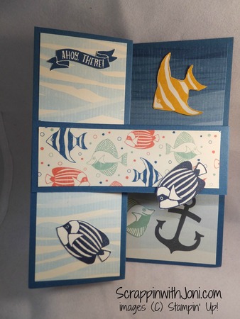 25 Sep 16 Fun Fold Fishes A simple fold + fishes = a fun birthday card. view products and instructions-> Dapper Denim 8-1/2" X 11" Cardstock 141414 By The Shore Designer Series Paper 141640 Very Vanilla 8-1/2" X 11" Cardstock 101650 Seaside Shore Clear-Mount Stamp Set 141625 Tuxedo Black Memento Ink Pad 132708 Calypso Coral Classic Stampin' Pad 126983 Crushed Curry Classic Stampin' Pad 131173 Mint Macaron Classic Stampin' Pad 138326 Dapper Denim Classic Stampin' Pad 141394 Night Of Navy Classic Stampin' Pad 126970 Comment Print