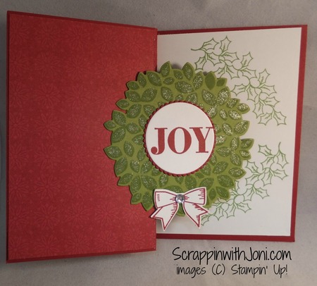 25 Sep 16 Fun Fold Joy Wreath An easy fun fold works just right with this wreath for a Christmas card. view products and instructions-> Cherry Cobbler 8-1/2" X 11" Cardstock 119685 Old Olive 8-1/2" X 11" Cardstock 100702 Whisper White 8-1/2" X 11" Cardstock 100730 Presents & Pinecones Designer Series Paper 141986 Cherry Cobbler Classic Stampin' Pad 126966 Wild Wasabi Classic Stampin' Pad 126959 Layering Circles Dies 141705 Clear Wink Of Stella Glitter Brush 141897 Wondrous Wreath Photopolymer Stamp Set 135047 Holly Jolly Greetings Clear-Mount Stamp Set 139882 Jar Of Cheer Photopolymer Stamp Set 142161 Holly Berry Happiness Photopolymer Stamp Set 142061 Wonderful Wreath Framelits Dies 135851 Holly Berry Builder Punch 141843 Rhinestone Basic Jewels Embellishments 119246 Comment Print