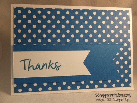 5 Oct 16 Pointer Thank You In need of a quick and easy thank you note? This card is for you. view products and instructions-> Whisper White Note Cards & Envelopes 131527 Brights Designer Series Paper Stack 138434 Whisper White 8-1/2" X 11" Cardstock 100730 Pacific Point 8-1/2" X 11" Cardstock 111350 Thankful Thoughts Clear-Mount Stamp Set 141522 Banner Triple Punch 138292 Pacific Point Classic Stampin' Pad 126951 Comment Print