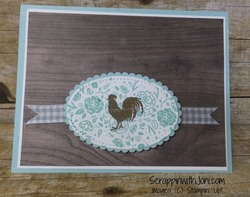 Stamp floral from Wood Words in Pool Party ink on Whisper White paper, cut this piece with oral framelit. Stamp rooster in Soft Suede ink in center of stamped oval.
