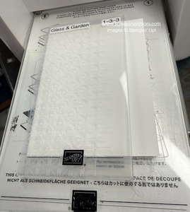 Card Front: Cut Basic White 3 ⅞ X 5 ⅛. Use a Glass & Garden embossing folder to emboss one edge of the white card front.