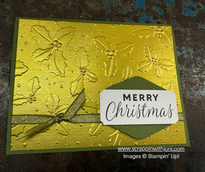 The Jolly Holly Embossing folder makes a great impression especially when paired with a metallic. This is a card that is easy to makes multiples of in a short time.