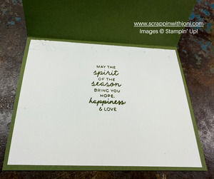 Stamp a sentiment from the Jolly Holly stamp set with Mossy Meadow ink before attaching this piece inside your card.