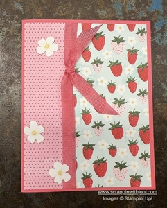 Card Front: Attach the 2 ½ X 5 ¼ Strawberry card front piece to the right side of the white card mat. Attach the 1 ½ X 5 ¼ polka dot card front to the left side of the white card mat.