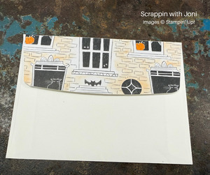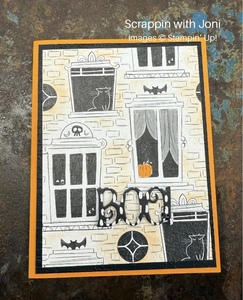 Card Front: Cut the house print from the Spooky Sweet Designer Series Paper pack 3 3/4 X 5. Attach the print paper to the Basic Black card mat. Emboss both papers with the Exposed Brick embossing folder. Attach the embossed card front to the Pumpkin Pie card base.