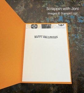 Card Insert: For the inside of your card, cut a piece of Basic White 4 X 5 ¼. Cut a piece of print paper used on the front of your card ½ X 4. Attach to the top of the card insert. Stamp a sentiment from Fright Night with black ink before attaching this piece inside your card.