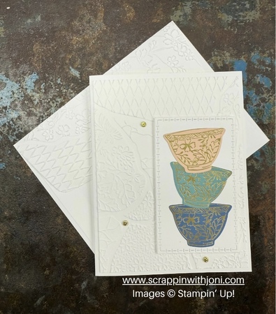 Kintsugi Inspirations is a beautiful suite. It includes a page of bowls and vases. I used the die cut that is part of the suite to cut the bowls. The embossing folder that is part of the suite has become my favorite embossing folder.